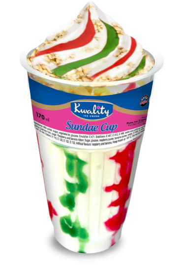 Ingredients: Water, milk solids, whey protein concentrate, vegetable fat, milk fat, liquid glucose, sugar; Emulsifier: Mono and diglycerides of fatty acids (E471); Stabilizers: carrageenan (E407), locust bean gum (E410), guar gum (E412), carboxymethly cellulose gum (E466) & Natural colour: annatton (E160B) and artificial vanilla flavour. Chocolate brownie: Butter, plain or dark chocolate pound, condensed milk, sugar, wheat flour, cocoa solids, baking powder, water. Cherry ribbon: Sugar, liquid glucose, water, acidity regulator: citric acid (E330); Stabilizers: sodium alignate (E401), pectin (E440), colours: (E122) (E132), (E129) and nature identical cherry flavour. Chocolate fudge sauce: Sugar, liquid glucose, cocoa solids; stabilizers: Glycerol (E422), sodium alignate (E401), carrageenan (E407), water & artificial vanilla flavour. Toppings: Cherry Fruits, milk chocolate shavings.