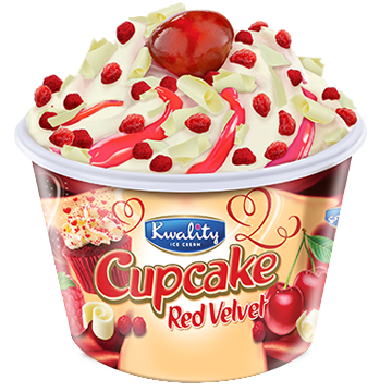 Red velvet semi milk ice swirled with raspberry sauce topped with red & white chocolate crunches on a red velvet cup cake covered with dark chocolate biscuit pieces.